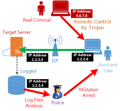 Moreover, since an IP address and a person is considered linked together, therefore the person who has had the IP address in question is responsible of every communication it involved. Recently we have seen a serious incident that our law enforcement agencies had arrested an innocent person who allegedly sent offensive contents to several companies. However, he has done nothing wrong-- it was all done by a remote person using a Trojan horse. The innocent was finally released, but it was one of the worst false accusation incidents in Japan's recent history.